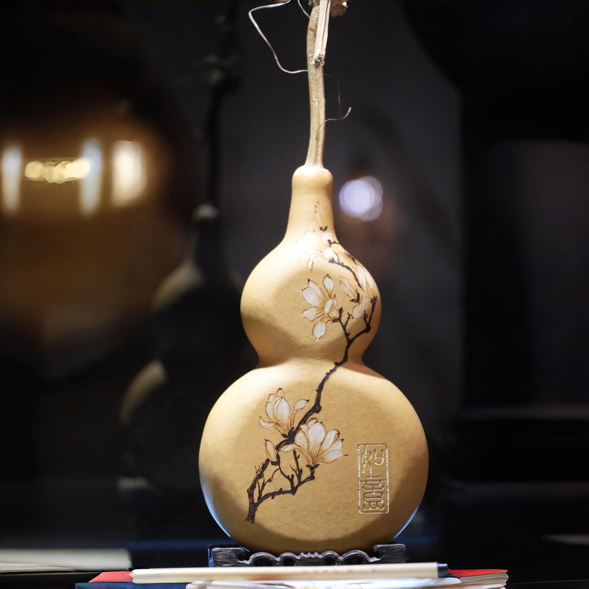 × 此件以模具塑形的壓平葫蘆為形,葫身描繪盛放玉蘭,枝幹以烙燒線條勾勒,花瓣留白呈現清雅之姿。